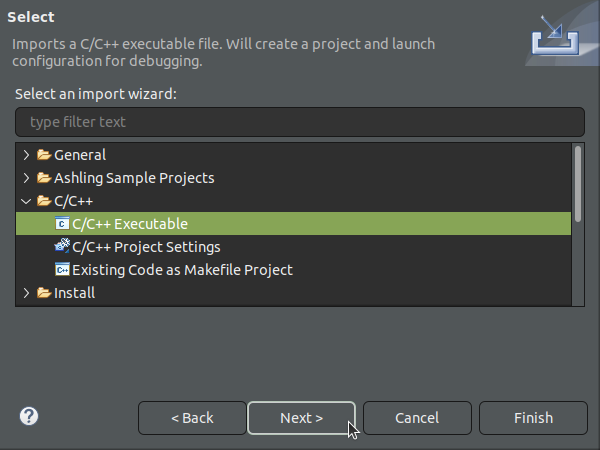 7. In Eclipse, go to File > Import > C/C++ Executable, then click Next.