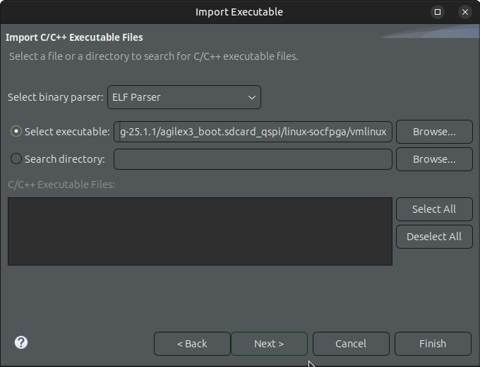 8. Click Browse to select the vmlinux executable from where it was built in the project, then click Next