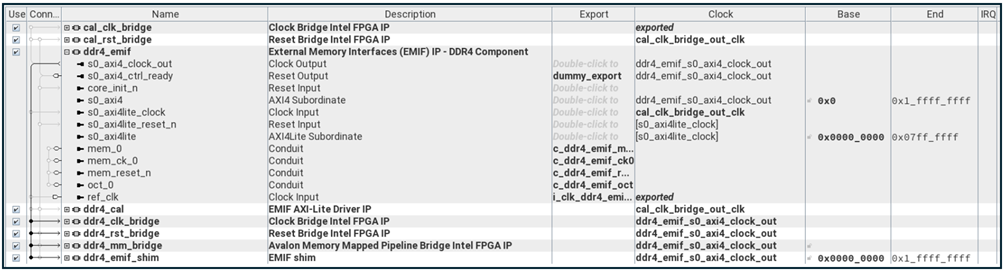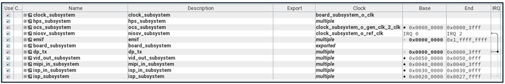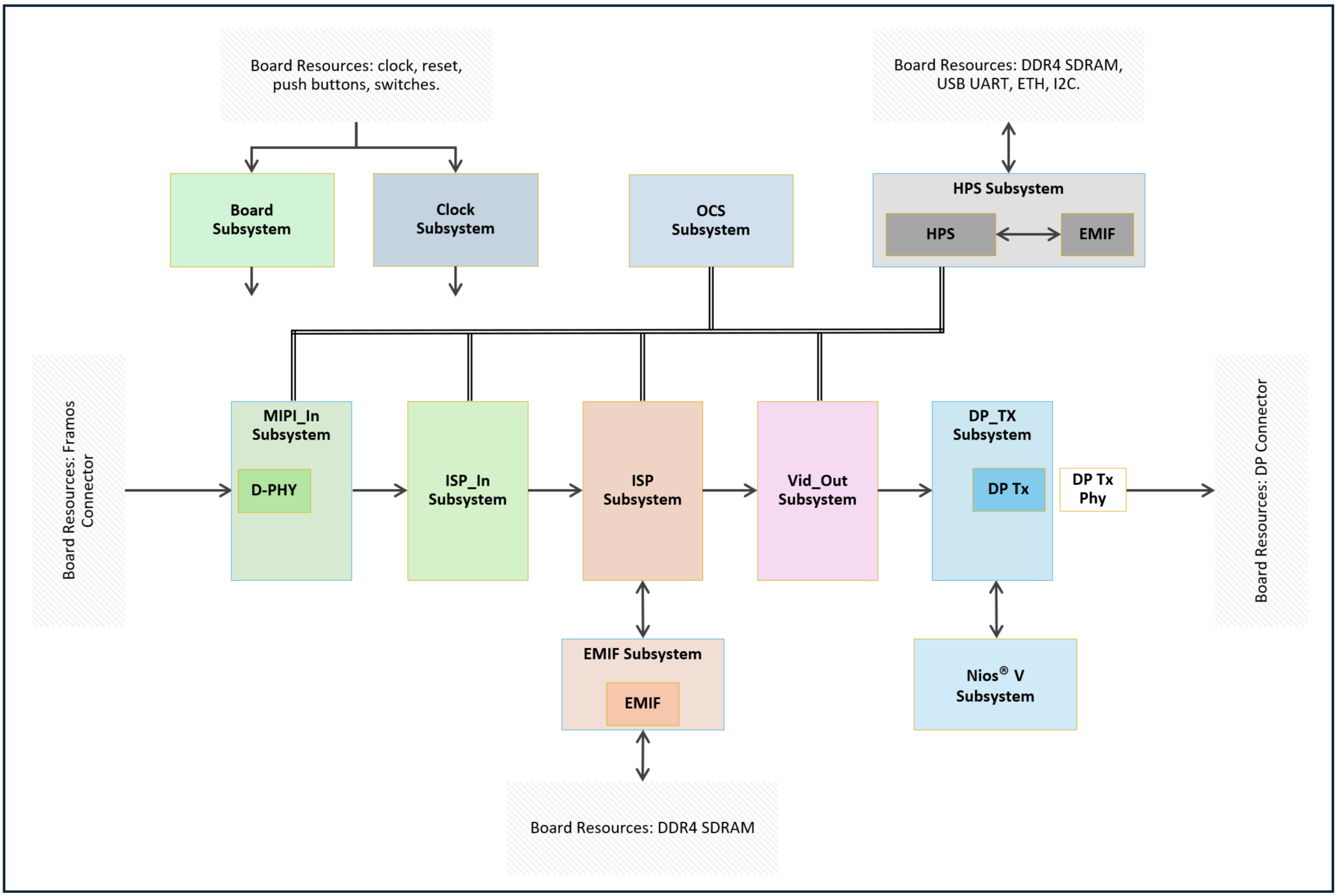 - The EMIF Subsystem is used for buffering image data and includes an EMIF for the FPGA DDR4 SDRAM on the development board.