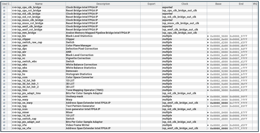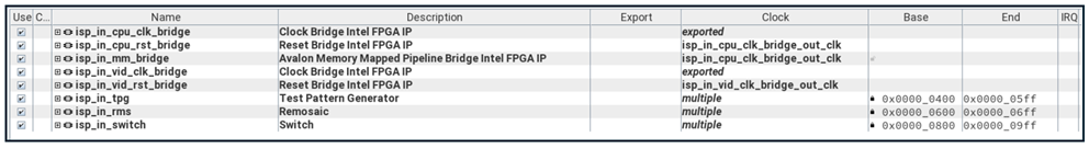 - MIPI_In, ISP_In, ISP, and VID_Out Subsystems are the blocks related to camera image ingress and Image Signal Processing (ISP). The MIPI_In Subsystem includes the D-PHY for interfacing the Framos MIPI connectors on the development board to the FPGA.