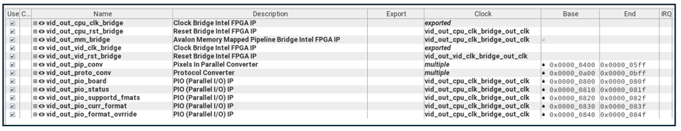IP to achieve the conversion. The VID_Out Subsystem also includes PIO IPs for