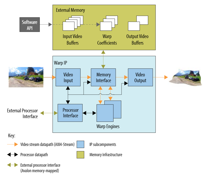The block diagram shows an external memory which is used to buffer the incoming and outgoing image data. The external memory also stores the coefficient tables used to control the Warp IPs operation and define the required image transform.