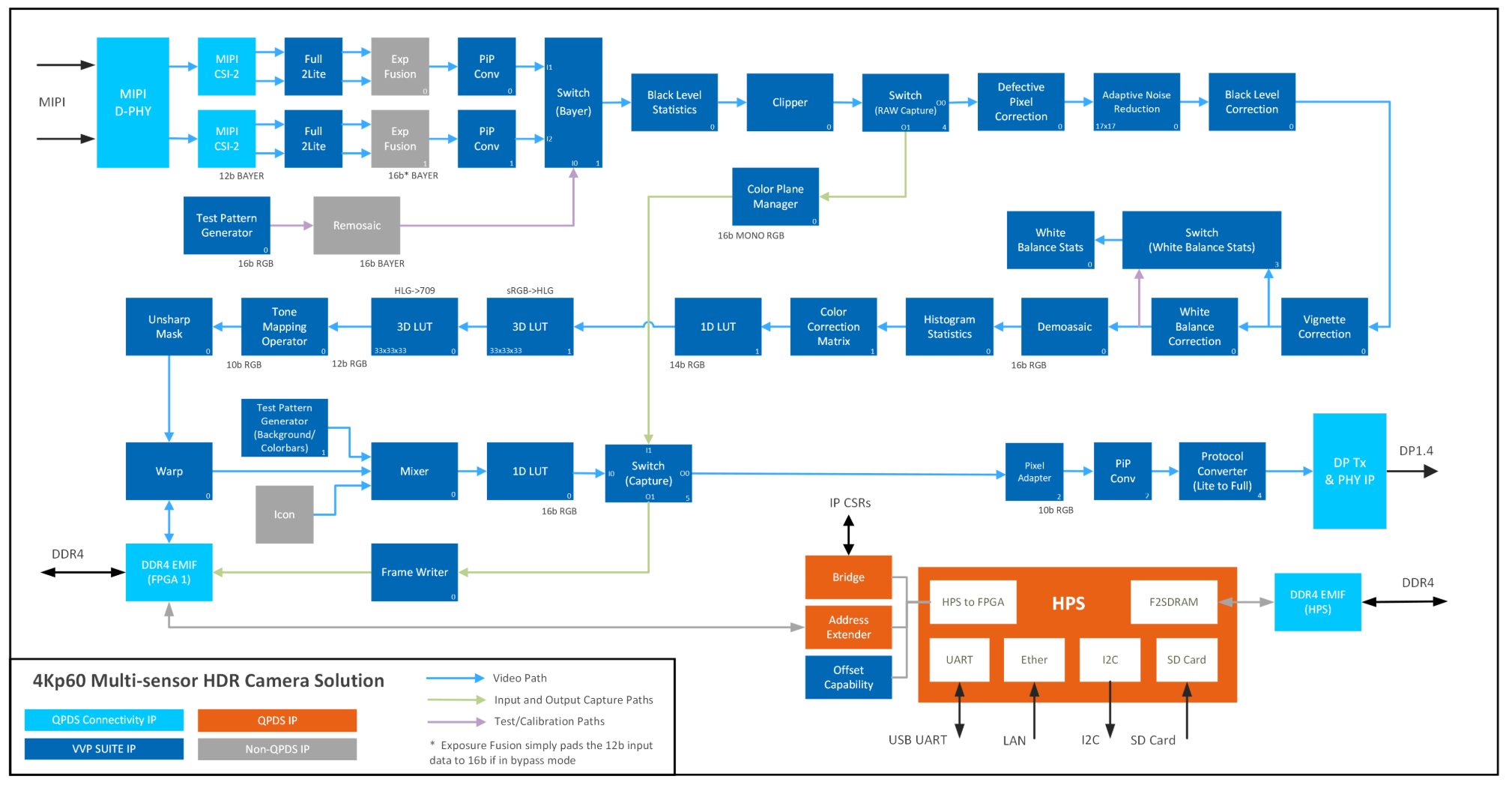 The 4Kp60 Multi-Sensor HDR Camera Solution System Example Design demonstrates a practical glass-to-glass camera solution using standard Altera® Connectivity and Video and Vision Processing (VVP) Suite IP Cores available through the Quartus® Prime Design Software (QPDS).