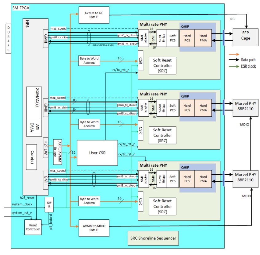 - The Multirate Ethernet PHY IP transmits outgoing traffic (from HPS GMII interface) and receives incoming traffic through GTS Transceiver PHY.