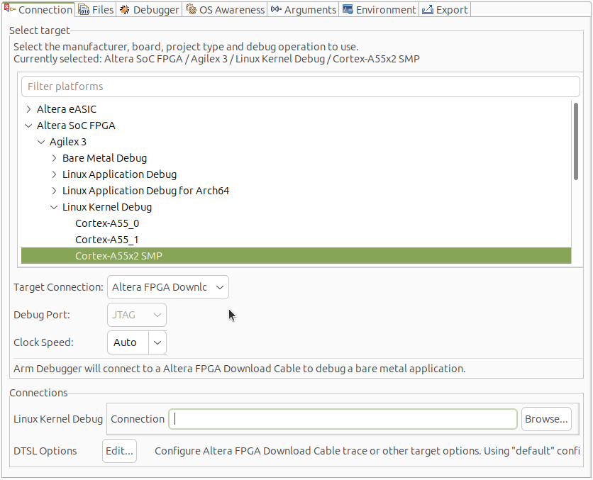 7. Select the target as Altera® SoC FPGA > Agilex 3 > Linux Kernel Debug > Cortext-A76\Cortex-A55 Multi-Cluster SMP. Select Target Connection as Altera® FPGA Download Cable.