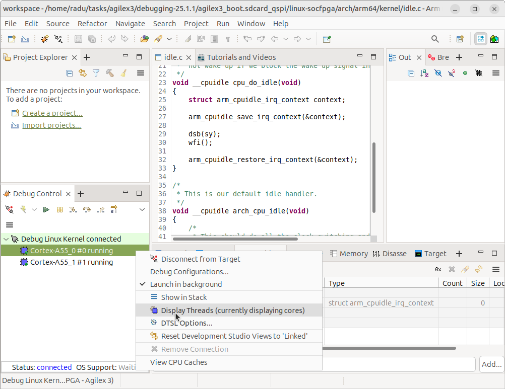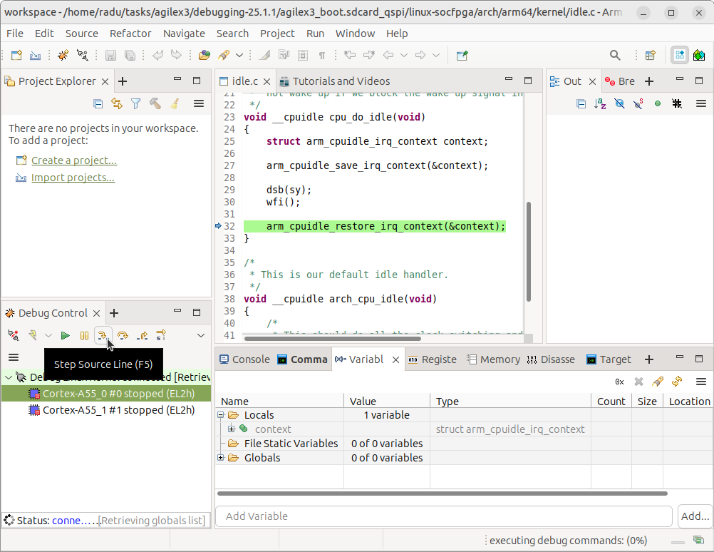 10. Click the Debug button on the bottom of the Debug Configuration window. The debugger will connect to the board, stop the cores, add the symbols from the vmlinux elf file and you can start debugging the kernel: