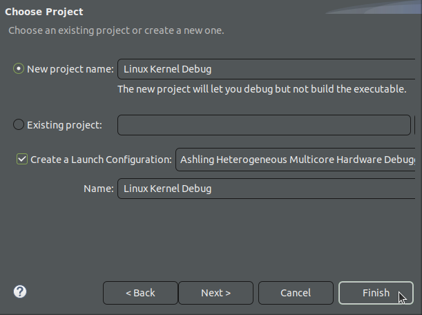 9. Change the New project name and Launch Configuration as "Linux Kernel Debug", select Ashling Heterogeneous Multicore Hardware Debug from the drop down box, and click Finish: