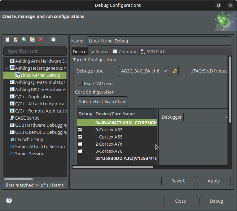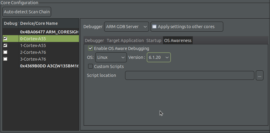 10. The Debug Configurations window will be opened, with the Linux Kernel Debug configuration selected. If not automatically selected, select the Debug probe from the drop down list, then Auto-detect Scan Chain. Then check all the four Arm cores, to enable debugging for them. The window should look like this: