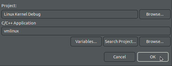 12. Go to Target Application tab. Click Add. The Browse Executable window appears. For Project, click Browse... and select the current project. For C/C ++ Application, click Browse... and select vmlinux as the executable. Click OK.