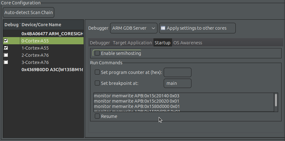 11. Make sure just the A55 cores are marked as enabled, as the A76's are not available on Agilex 3. Click on 0-Cortex-A55 core, and enter the following commands in the Commands section:
