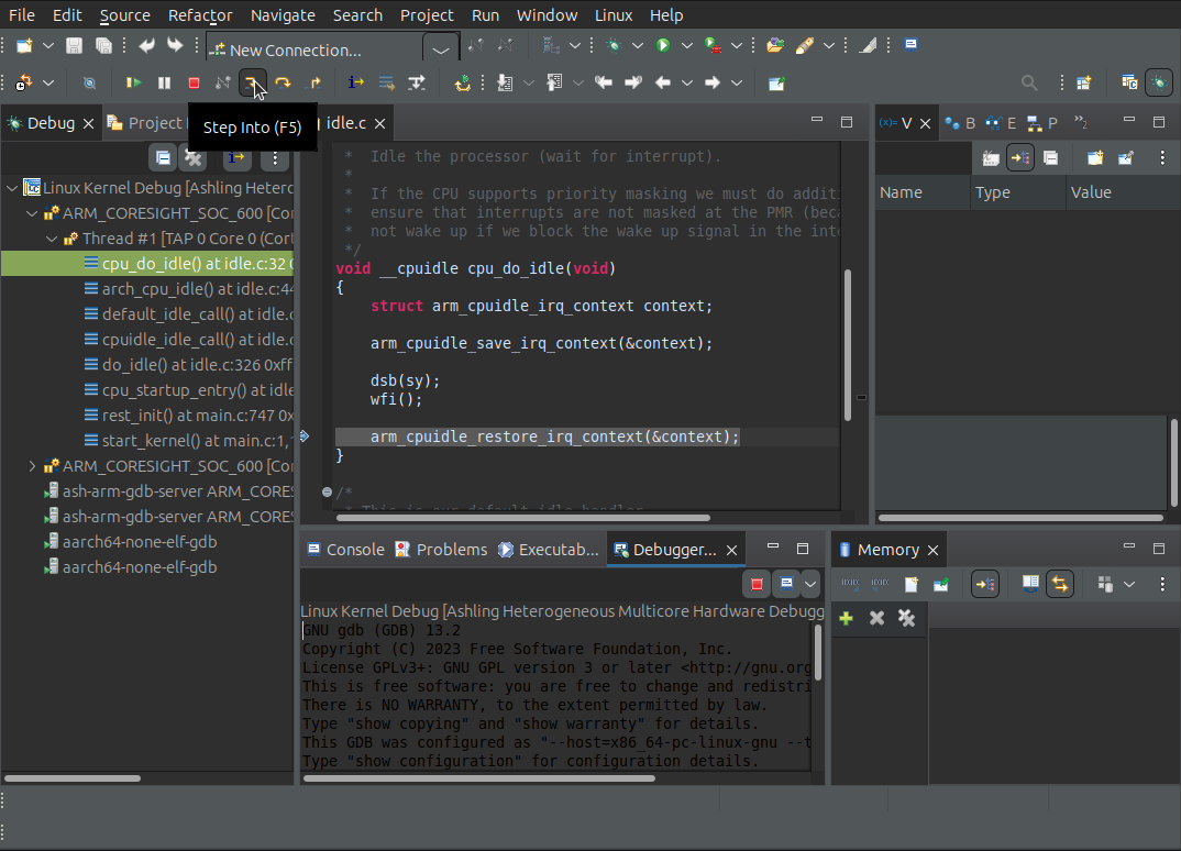 19. Eclipse will show the Linux kernel stopped in the debugger:
