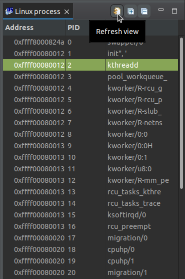 21. Go to Linux > Processes > List Running Processes, and then the debugger shows the processes. You may need to click the Refresh view button on the window for the processes to show up.
