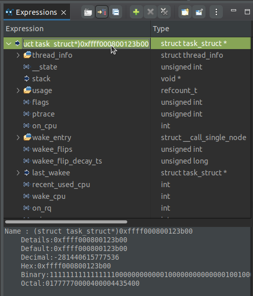 23. The debugger opens the process in the Expressions window. You can now inspect and modify its properties: