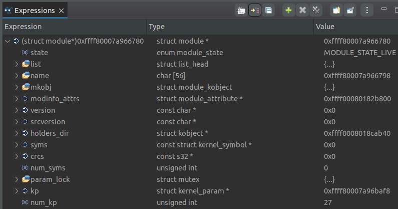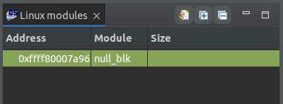 24. Break the execution in the debugger, by clicking the Suspend button. Then go to Linux > Modules > List loaded modules to see the module that was loaded:
