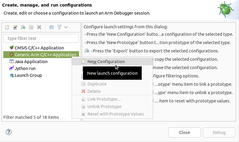 6. Right click Generic Arm C/C++ Application and select New Configuration