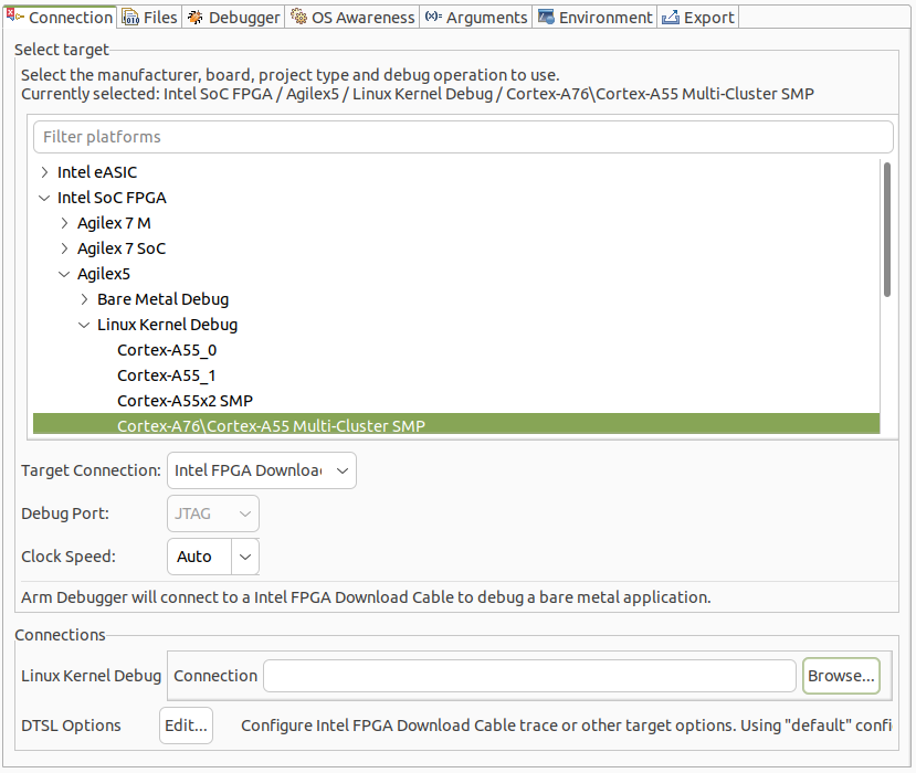 7. Select the target as Altera® SoC FPGA > Agilex 5 > Linux Kernel Debug > Cortext-A76\Cortex-A55 Multi-Cluster SMP. Select Target Connection as Altera® FPGA Download Cable.