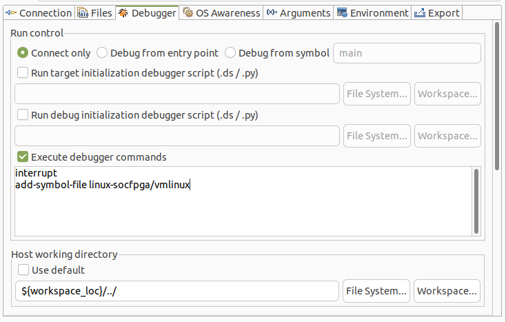 9. Go to the Debugger tab, select Connect only, check Execute Debugger Commands and add the commands shown below. Also uncheck the Use default for the host working directory, and add the text shown below indicating working folder is the parent folder of the workspace folder: