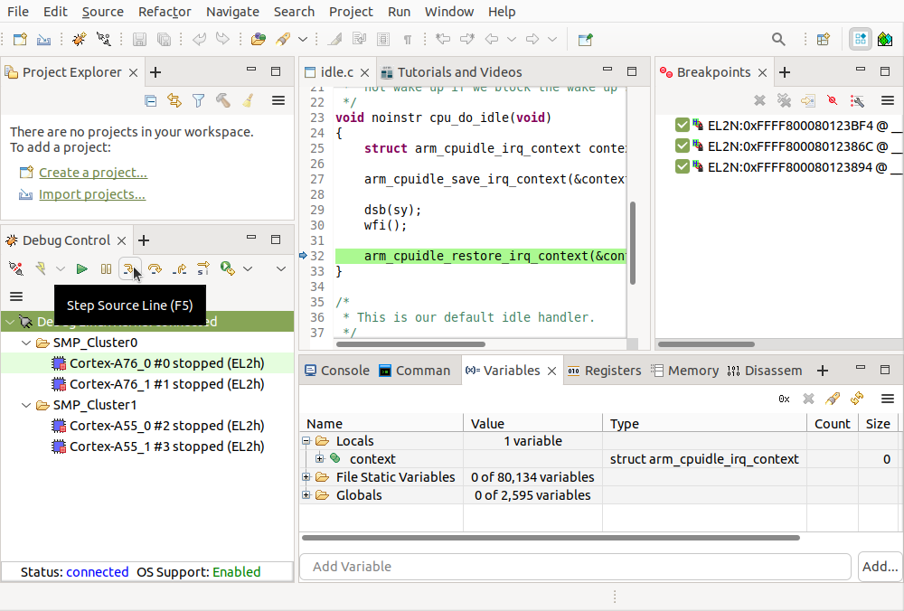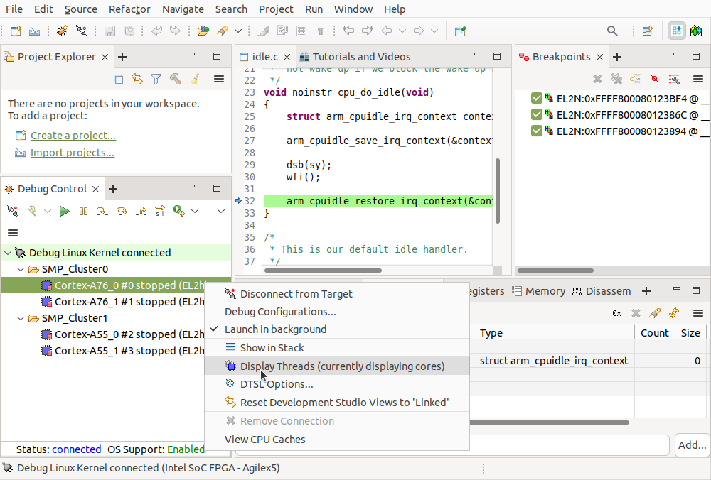 14. The above were only examples of what you can do with the debugger. The tool offers a lot of other powerful capabilities to enable you to debug the Linux kernel. For more information refer to Arm* Development Studio.