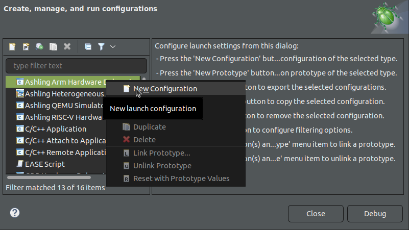 8. In the Debug Configurations window, select Ashling Arm Hardware Debugging on the left panel, right-click it then select New Configuration from the menu.