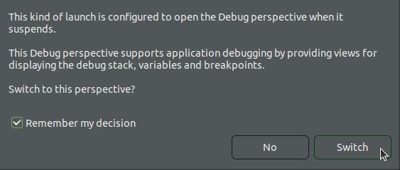 12. Eclipse will suggest to move to the debug perspective. Click Switch to accept: