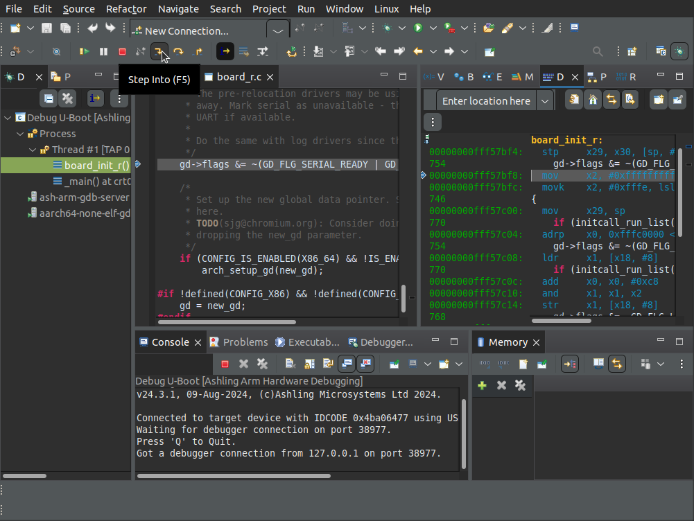 If then you want to load U-Boot and start debugging it, add the following lines to the previous step, which will load U-Boot, run it until the memory is relocated, perform the relocation, then drop to debugging mode