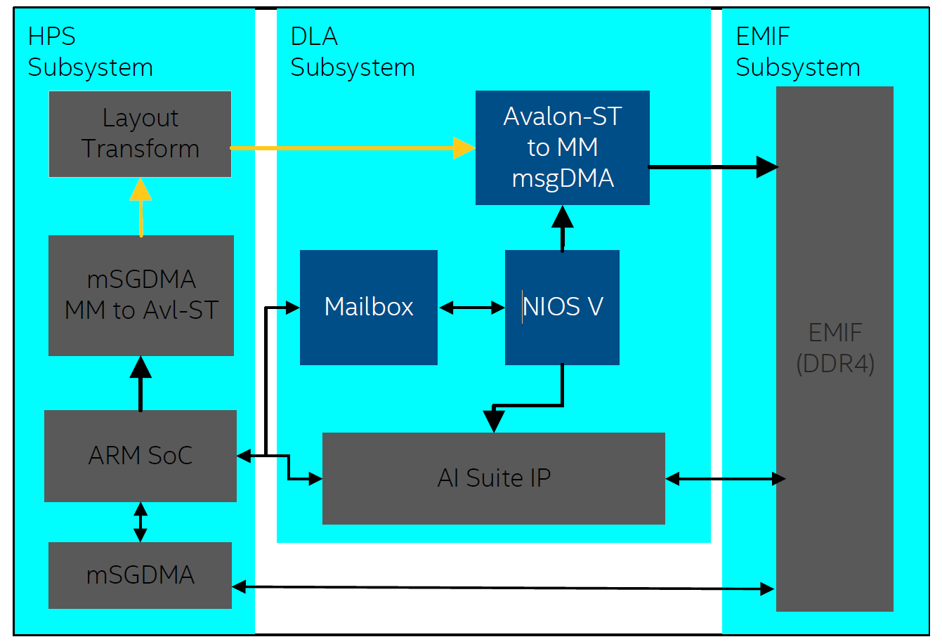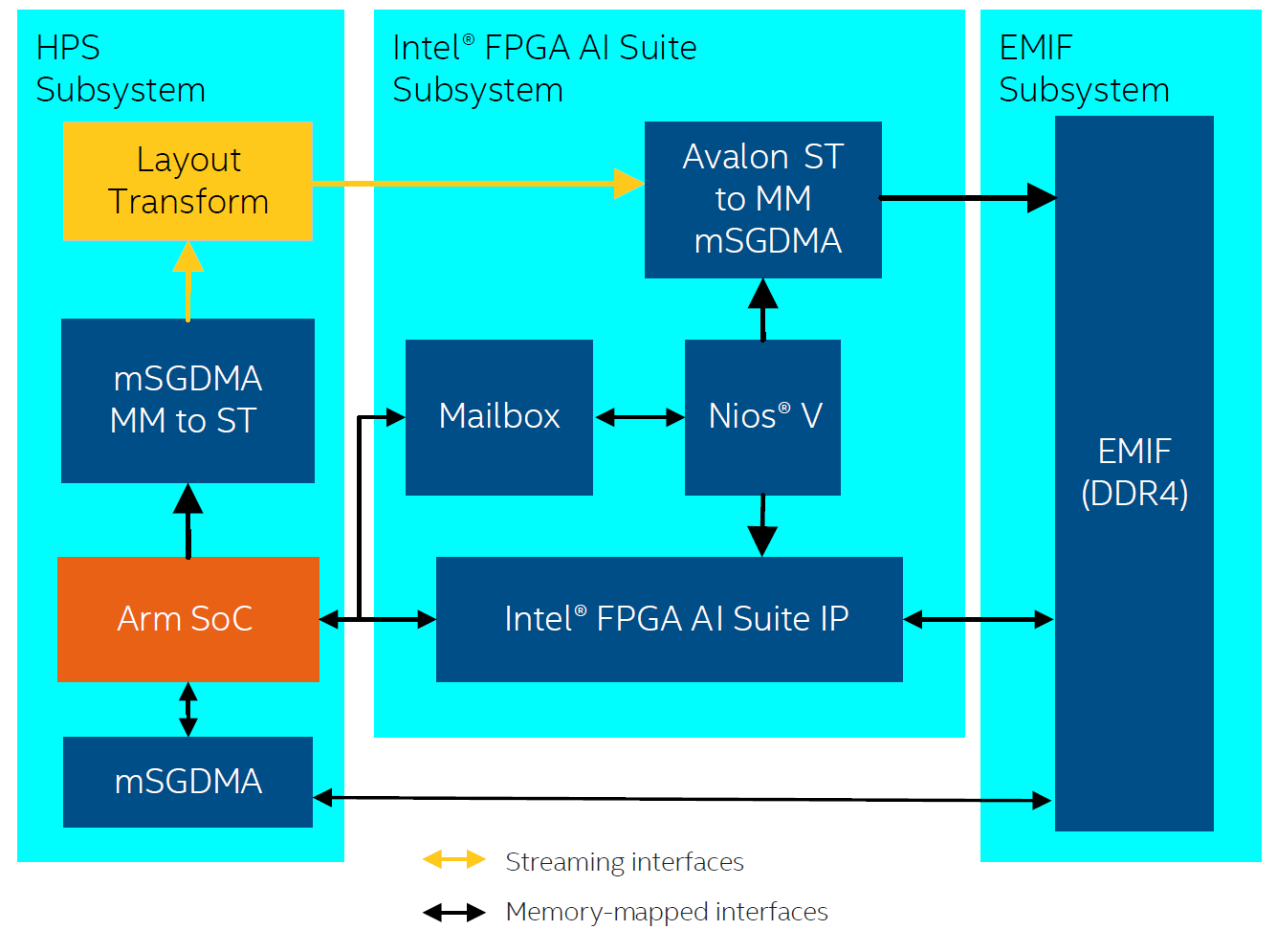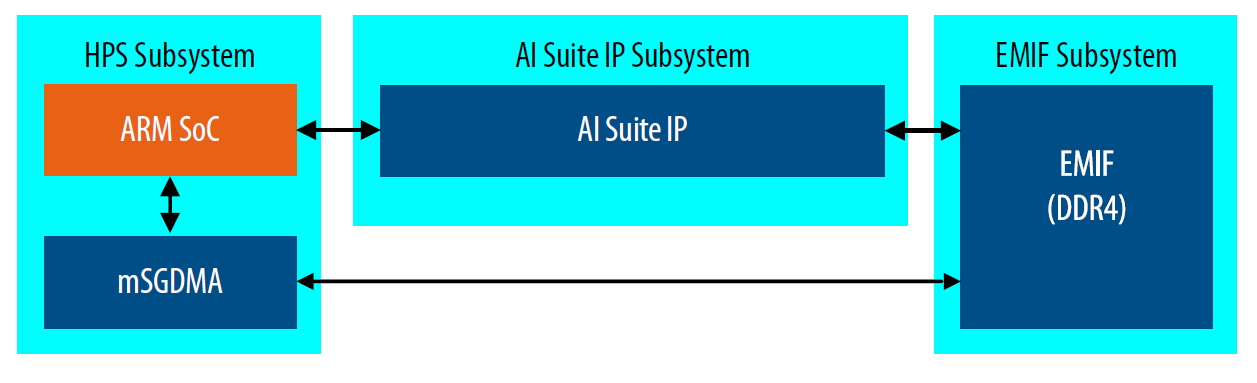 S2M Streaming input data is copied to FPGA on-device memory. The FPGA AI Suite runtime runs on the FPGA device (HPS or RTL state machine). The runtime is used only to coordinate the data transfer from FPGA DDR memory into the FPGA AI Suite IP.