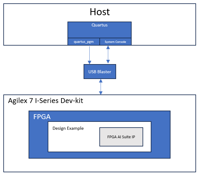 | Hostless JTAG design example | Demonstrates the step-by-step sequence of configuring FPGA AI Suite IP and starting inference by writing into CSRs directly via JTAG. This design example targets the Agilex 5 FPGA E-Series 065B Modular Development Kit (MK-A5E065BB32AES1). |