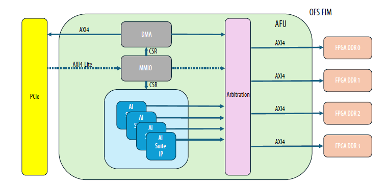 The design example hardware implementation, sits in the AFU (acceleration functional unit) region and uses the OFS FIM (FPGA interface manager) to connect to both the host CPU via a PCIe connection and also to the on-board DDR4 memory.