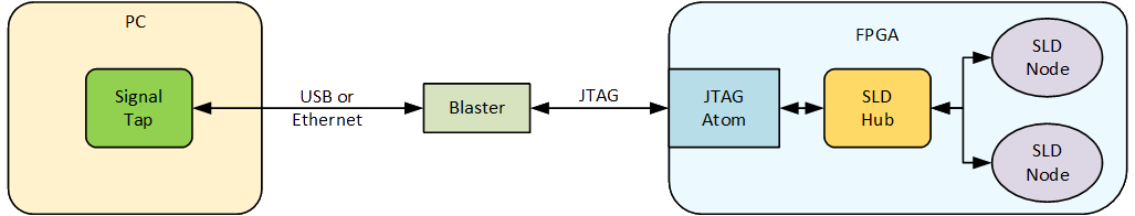 In the traditional approach the SLD communication solution was based on the Altera JTAG Interface (AJI) which interfaced with the JTAG TAP controller (hard atom in Altera devices which implements the JTAG protocol). The SLD tools used the JTAG channel for communication between software and hardware.