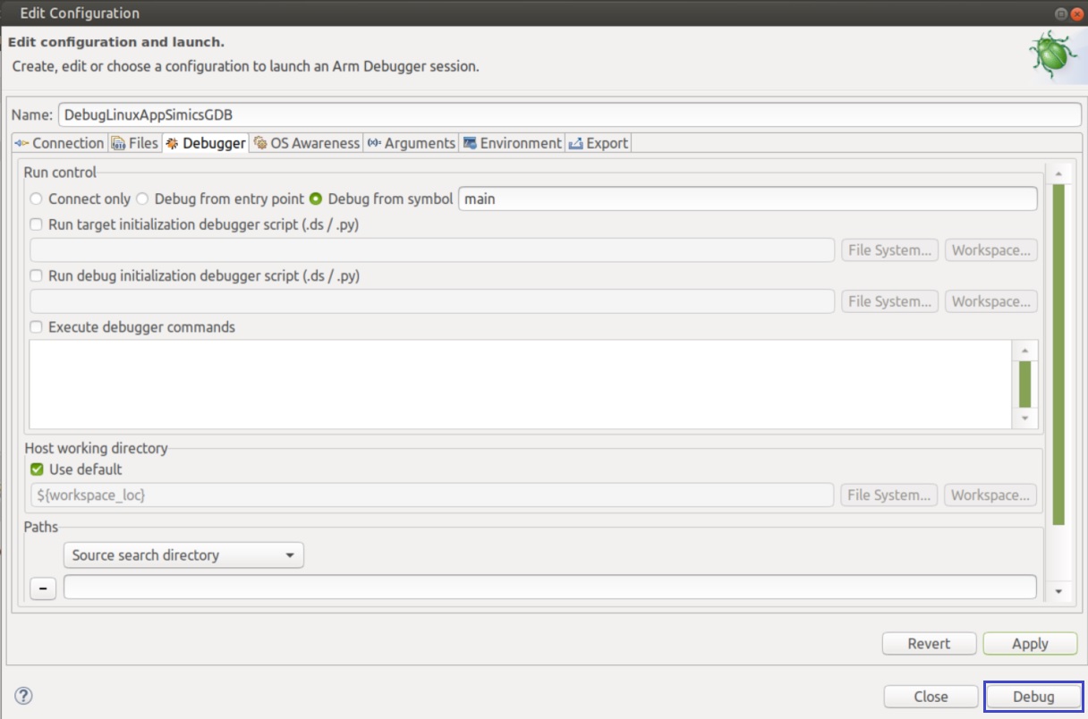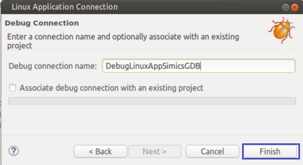 b) Give a name to the Debug connection: DebugLinuxAppSimicsGDB . Press Finish.