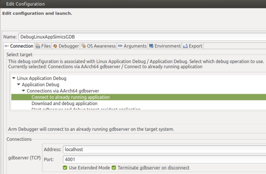 - Linux Application Debug → Application Debug → Connections via AArch64 gdbserver → Connect to already running application