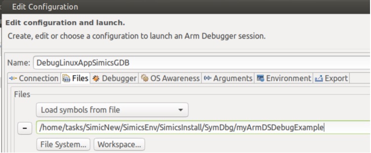 - Select Terminate gdbserver on disconnectd) Edit the configuration. In Files tab, select the application binary loaded as symbol file:
