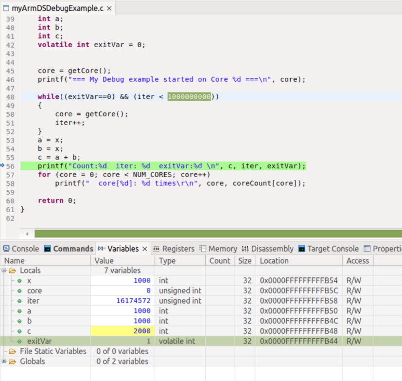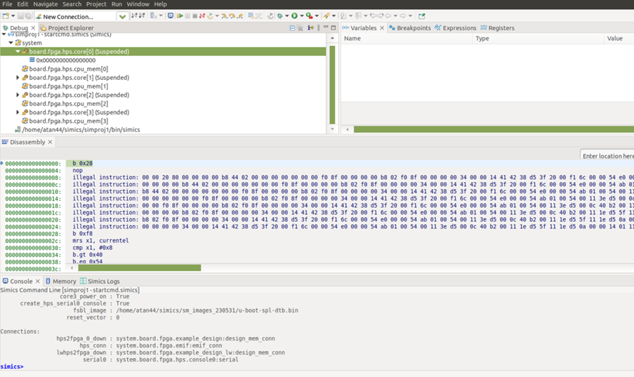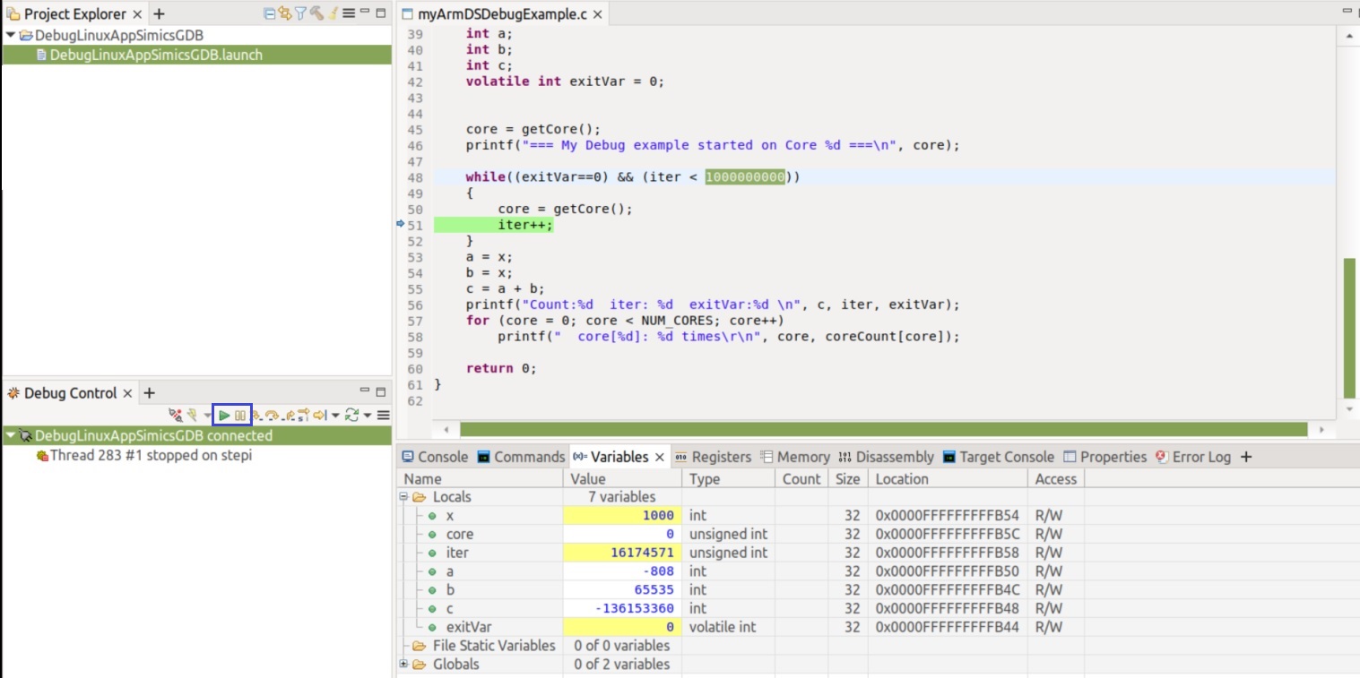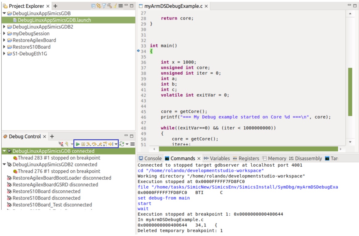 This use case is an extension of the Use Case: Exercise SDCard Boot Flow from FSBL to Linux and consists of performing a debug session in a Linux user mode application using ARM Development Studio. For this, the debugging is done using the GDB server running in the target system. Also, set up the Simics network connectivity with the host PC, which is the one that runs ARM DS through TCP protocol. The application to be debugged is listed next myArmDSDebugExample.c. This application determines the core in which this run started and then enters into a loop counting the number of times the loop is executed and continue observing the execution core. It also counts the number of times the application is executed in each one of the four cores. The application exits from the loop when the iterator reaches a limit or the exitVar variable has a value of '1', which normally never should occur. After the loop, the application assigns the value in x variable to the a and b variables and then adds these variables and assigns the result value in c variable. In the end, the application prints the result of the addition, the number of times the loop was iterated and the final value of exitVar, and the number of times each core executed the application.