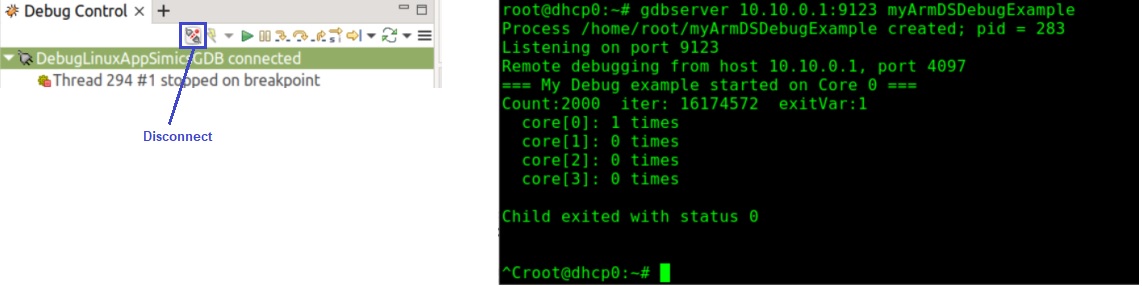 c) Proceed to continue the code execution and observe that the application gets finished printing the results. Also, you can get disconnected from the gdb server session and after this, the serial console shows again the Linux prompt.