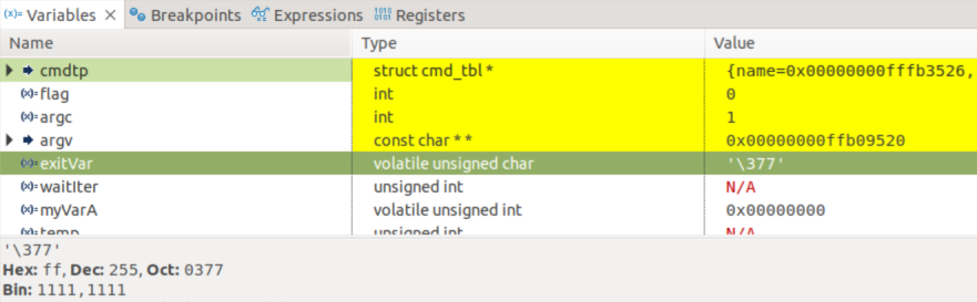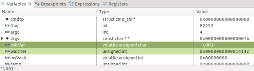Run the test and wait until the breakpoint triggers. To modify the loop conditions for debugging purposes, you can modify the value of exitVar in the Variable window. For example, changing the value of exitVar from ‘\377’ (this is a random value assigned by the system) to ‘\001’. As