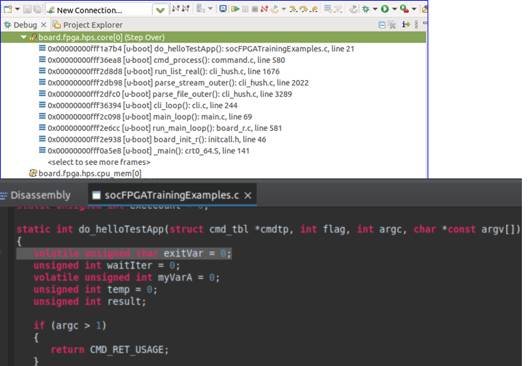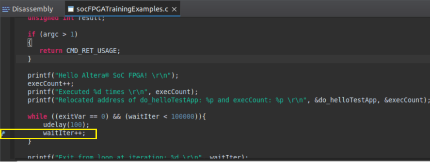 As the first breakpoint is met, the program is halted at the entry point of the do_helloTestApp() function. You will see the source code of the application (socFPGATrainingExamples.c). Use the step into/step-over buttons