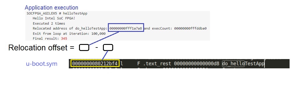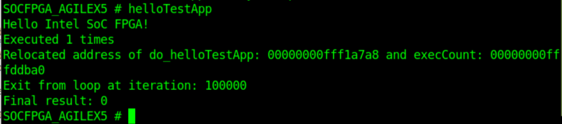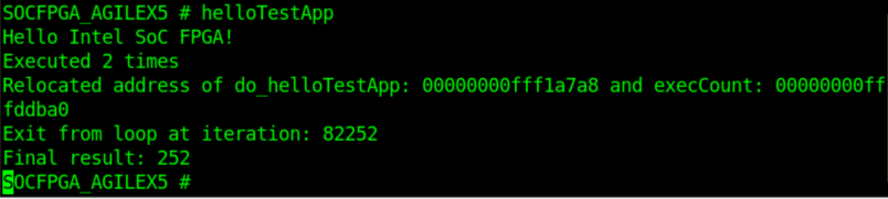 SOCFPGA_AGILEX5 # helloTestApp Hello Altera® SoC FPGA! Executed 1 times Relocated address of do_helloTestApp: 00000000fff222d0 and execCount: 00000000fffddba0 Exit from loop at iteration: 9691 Final result: 691 SOCFPGA_AGILEX5 #From the output print, it shows that the program iterated for 9691 loops before hitting the Line-34 breakpoint you planted, this number would be bigger if you waited longer before planting the breakpoint. Lastly, the modification of exitVar ended the program.