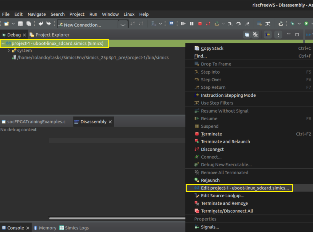 In the Debug view, select the project - uboot-linux_sdcard.simics and select Edit project to configure the debug session: