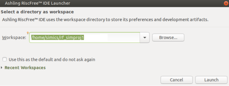 Following the command, you must set up a RiscFree workspace. You should use a new directory as a RiscFree workspace which must be different and outside from the Simics project directory.