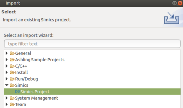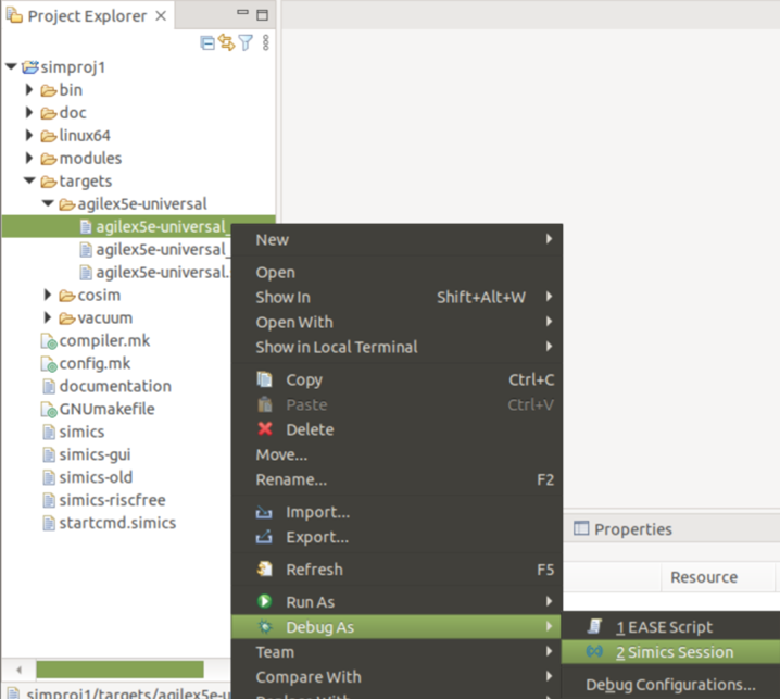 From the Project Explorer window, right-click on the target script you want to launch (uboot-linux_sdcard.simics) and select “Debug As > Simics Session”.