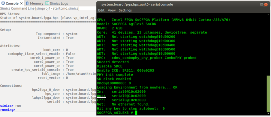 The Agilex™ 5 Simics virtual platform models the HPS processor with two Arm Cortex-A55 cores, two Arm Cortex-A76 cores, and HPS peripherals. The Agilex™ 5 E-Series HPS virtual platform is released as part of the Simics® Simulator for Altera® FPGAs software, which also includes a virtual platforms where the Agilex™ 5 device is instantiated, emulating the concept of having different versions of a development kit or daughter cards.
