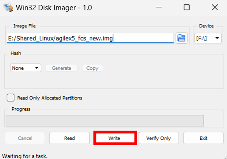On Windows, use the Win32DiskImager program, available at https://sourceforge.net/projects/win32diskimager. Write the image as shown in the next figure: