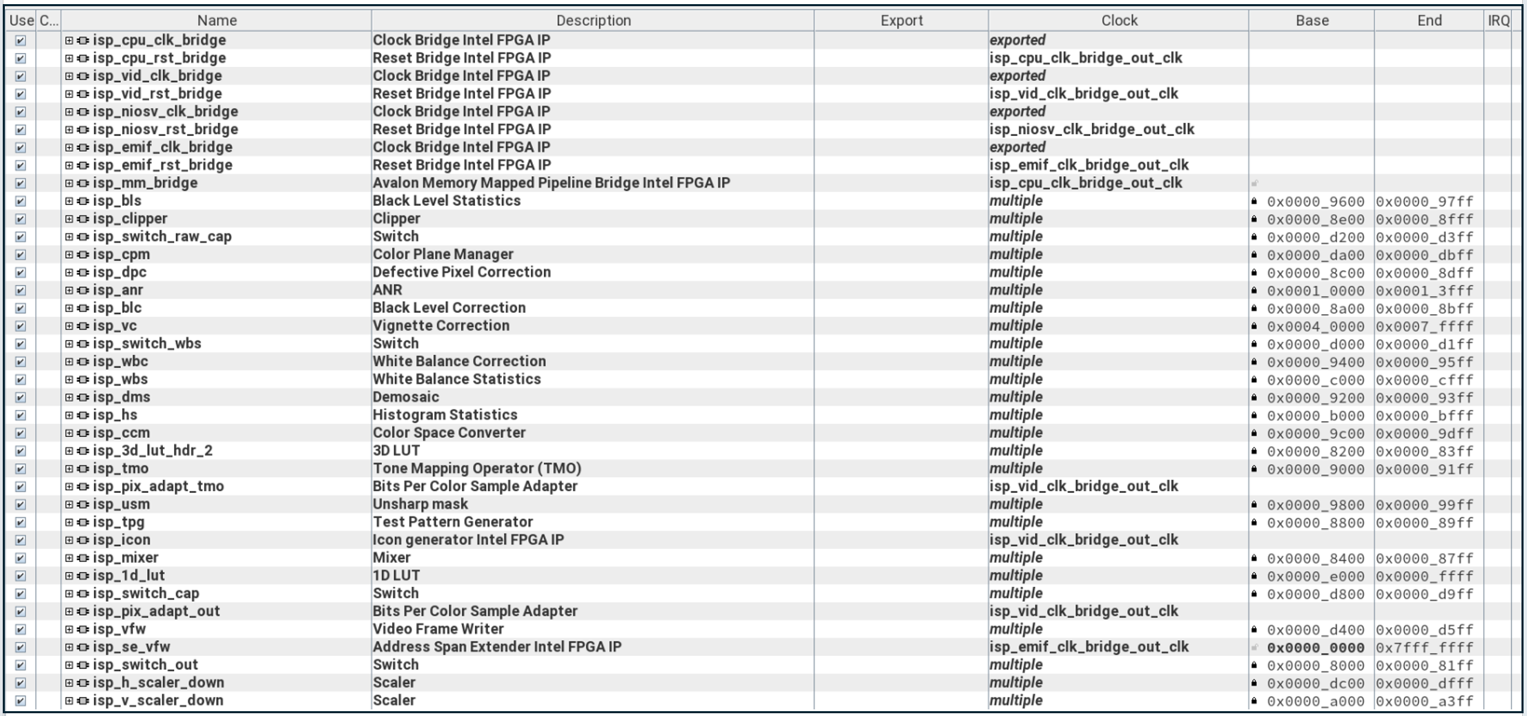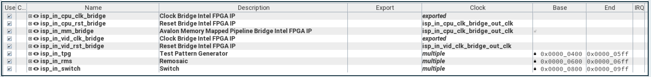 - MIPI_In, ISP_In, ISP, and VID_Out subsystems are the IP related to camera image ingress and Image Signal Processing (ISP). The MIPI_In subsystem includes the D-PHY for interfacing the Framos MIPI connectors on the Modular Development Kit Carrier Board to the FPGA.
