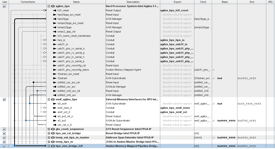 hps_subsystemis an instance of the Agilex™ 5 HPS, which operates the higher-level software stack in Linux. It includes an External Memory Interface (EMIF) to the on-board DDR4 chip, featuring presets and connections to link the HPS2FPGA AXI bridges to other subsystems. -