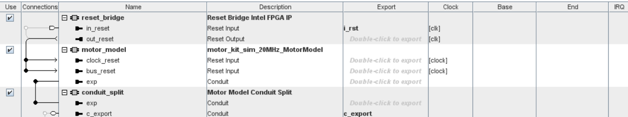 dniosv_subsystem,motor_model_subsystem,drive_subsystemandcontrol_subsystemare blocks related to motor control and motor modeling. These are instantiated to achieve 6 motor drives being controlled in the FPGA fabric (3 NiosV/g cores controlling 2 drive subsystems each).For more information on these blocks, refer to AN 1000: Drive-on-Chip Design Example: Agilex™ 5 Devices