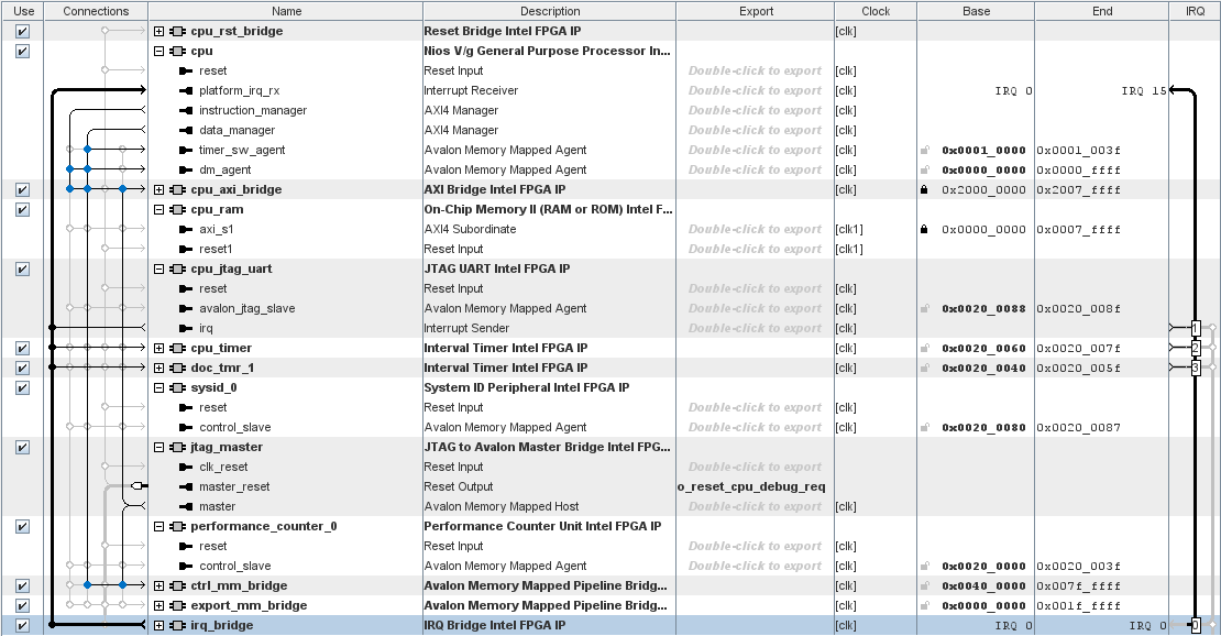 The NiosV/g processor subsystem offers a fully functional processor system with debugging capabilities. The NiosV/g processor subsystem comprises the following Platform Designer components: * NiosV/g softprocessor * On-chip RAM * JTAG master * IRQ management * JTAG UART * Timers * Performance counters