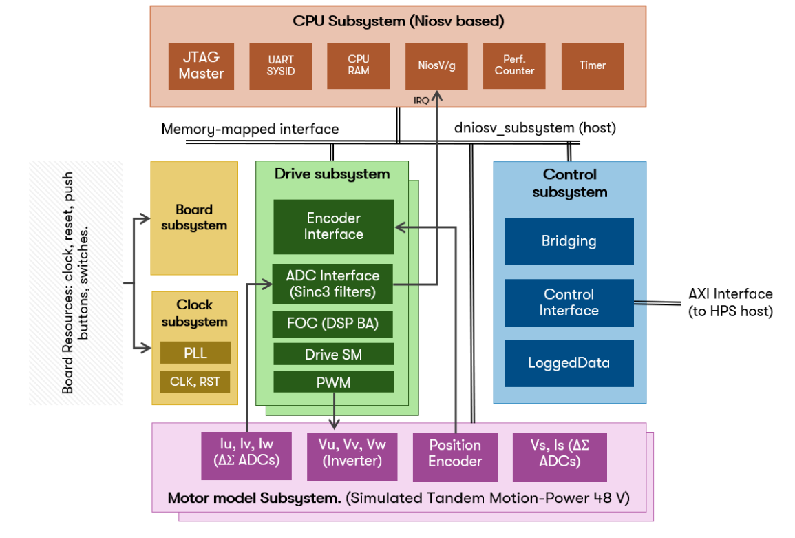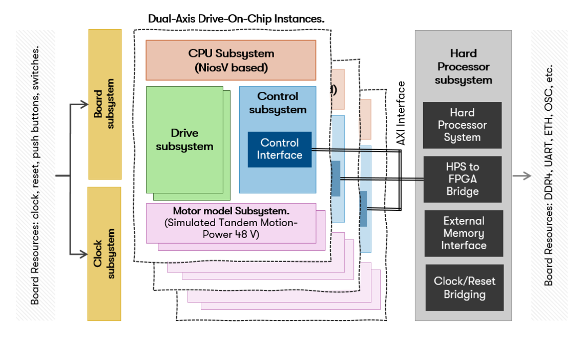 This project variant is based on AN 1000: Drive-on-Chip Design Example: Agilex™ 5 Devices and AN 994: Drive-on-Chip Design Example for Altera® Agilex™ 7 Devices. In this design an HPS Subsystem (Hard Processor System) has been included to provide a higher level of abstraction for motion control.