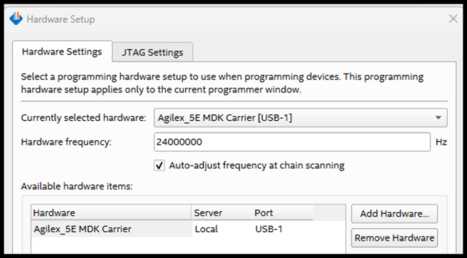 - Launch the Quartus® Programmer and Configure the "Hardware Setup..."