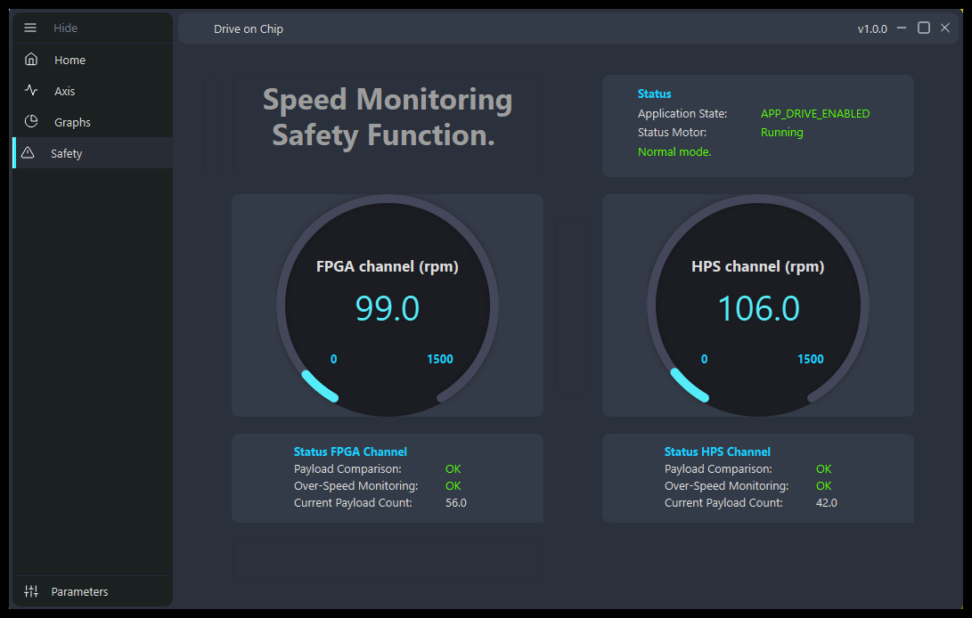 - When the GUI is running, change to the Safety tab, in the left panel, with the ! symbol. The tab summarizes of the safety status of the design.The Safety tab shows information about the status of both safety channels, FPGA and HPS. The estimated speed, the payload comparison results, the over-speed detection and the payload count. The Status widget shows if the motor goes into safe state.