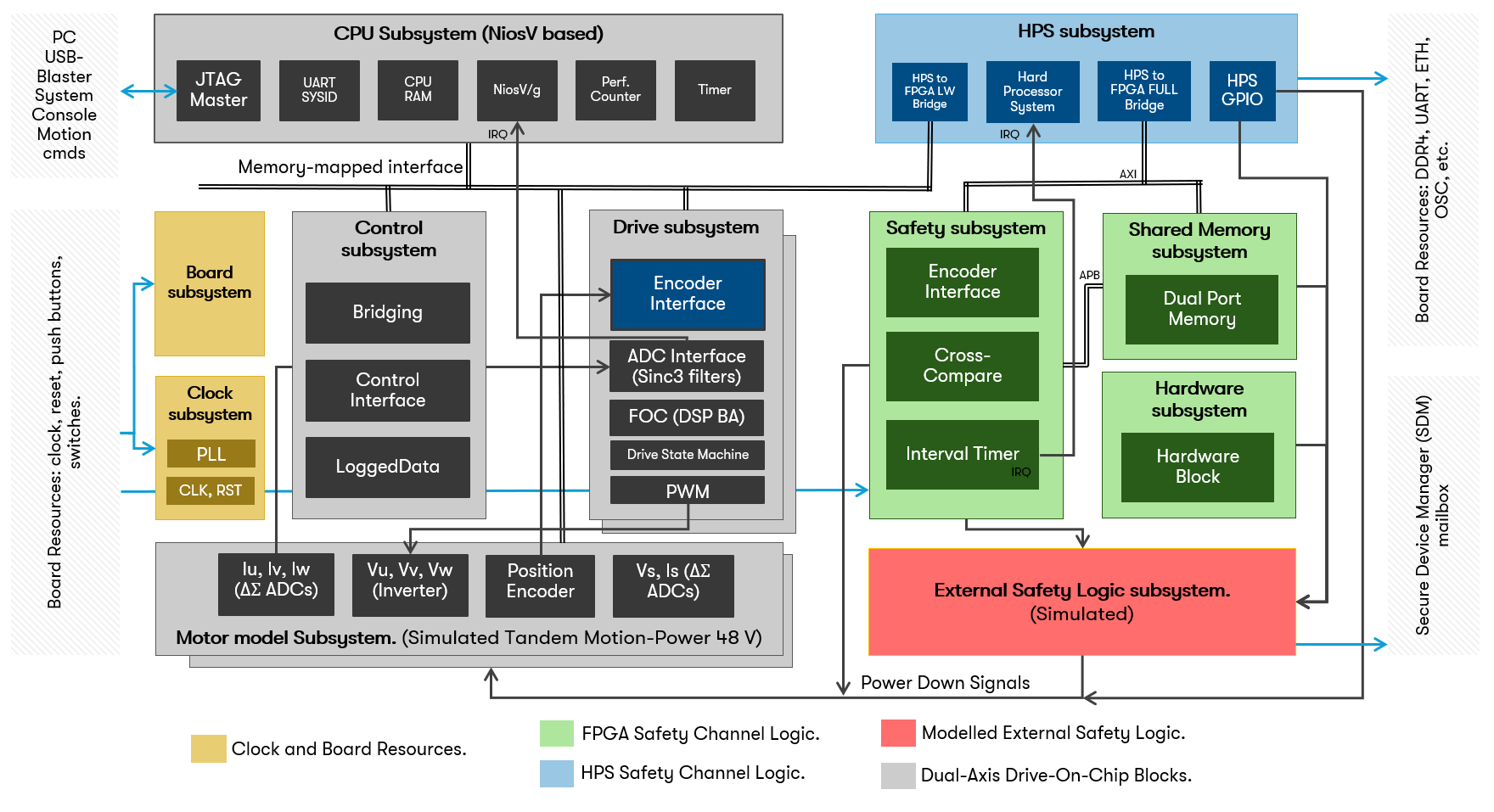 This design demonstrates synchronous control of up to two three-phase permanent magnet synchronous motors (PMSMs) or brushless DC (BLDC) motors. The design includes a motor and power board model that removes the need for a physical motor setup. This design is an extension of the existing Drive-on-Chip Design Example for Agilex™ 5 Devices. It includes safety function to demonstrate how Agilex™ 5 SoC devices may achieve IEC 61508 SIL 2 or ISO 13849 Cat 3 PL d safety certification.